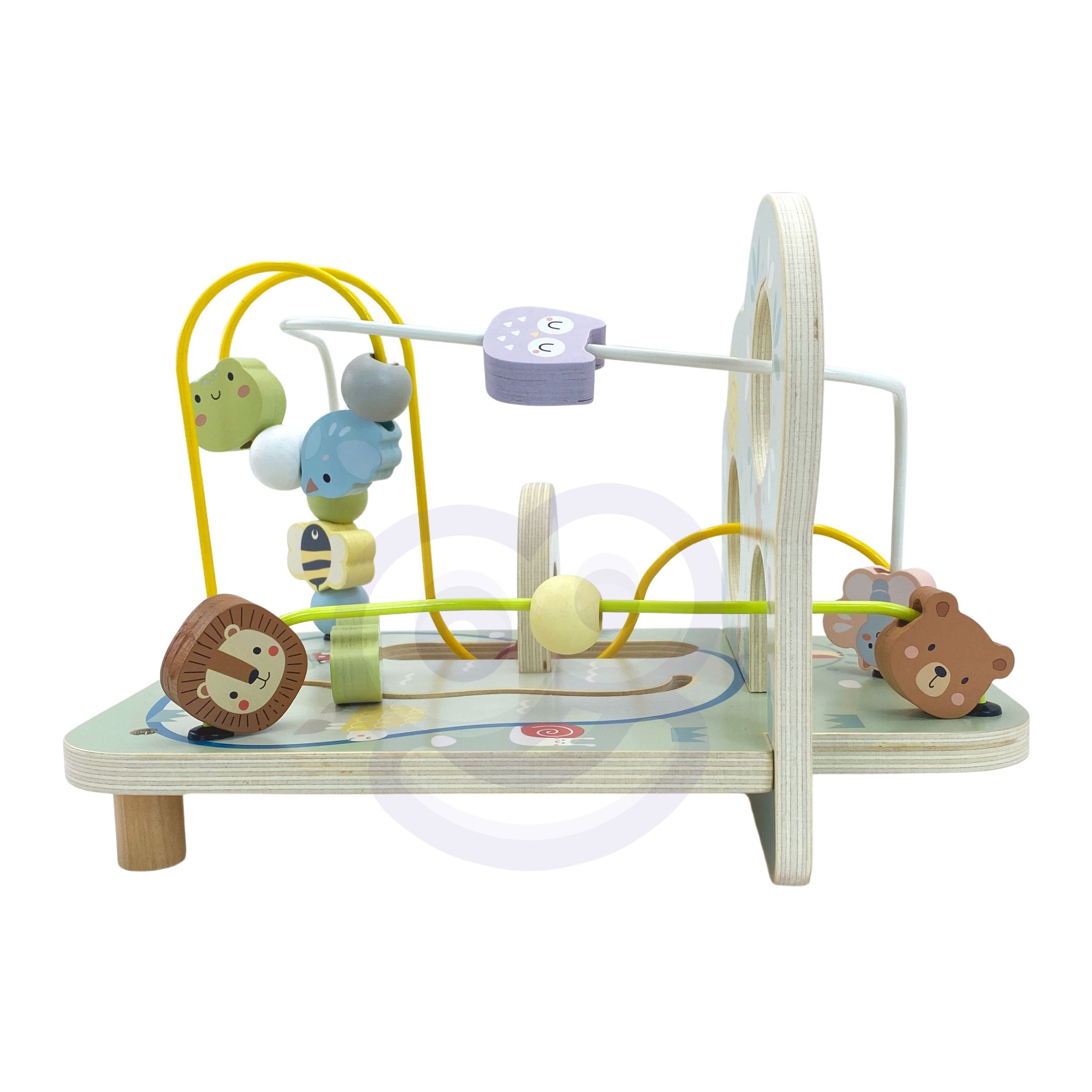 - na drewnianej podstawie znajdują się 3 pętle motoryczne z kolorowymi koralikami i żetonami z motywem leśnych zwierząt