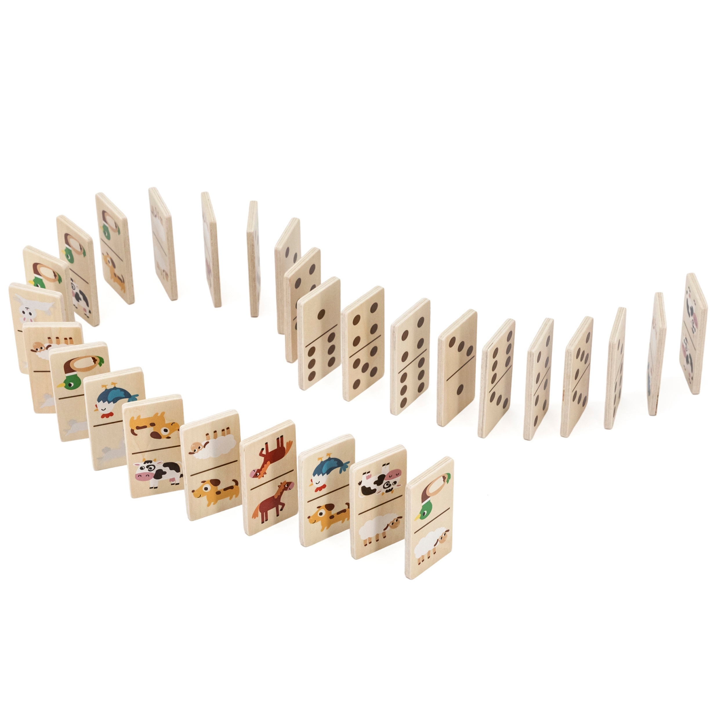 VIGA Drewniane Domino 2w1 Zwierzęta i Liczby to doskonała zabawa edukacyjna, która w zabawny uczy dzieci logicznego myślenia i podstaw matematyki. Dzięki dwustronnym płytkom maluchy mogą grać w klasyczne domino z kropkami lub uczyć się poprzez dopasowywanie zwierzątek. Gra polega na dokładaniu płytek od końca do końca – zwycięzcą zostaje ten, kto pierwszy pozbędzie się wszystkich swoich elementów. Dzięki solidnemu, drewnianemu pudełku zestaw można łatwo przechowywać i zabierać ze sobą w podróż. Drewniane domino to świetny sposób na naukę poprzez zabawę – zarówno samodzielnie, jak i w gronie rodziny czy przyjaciół.