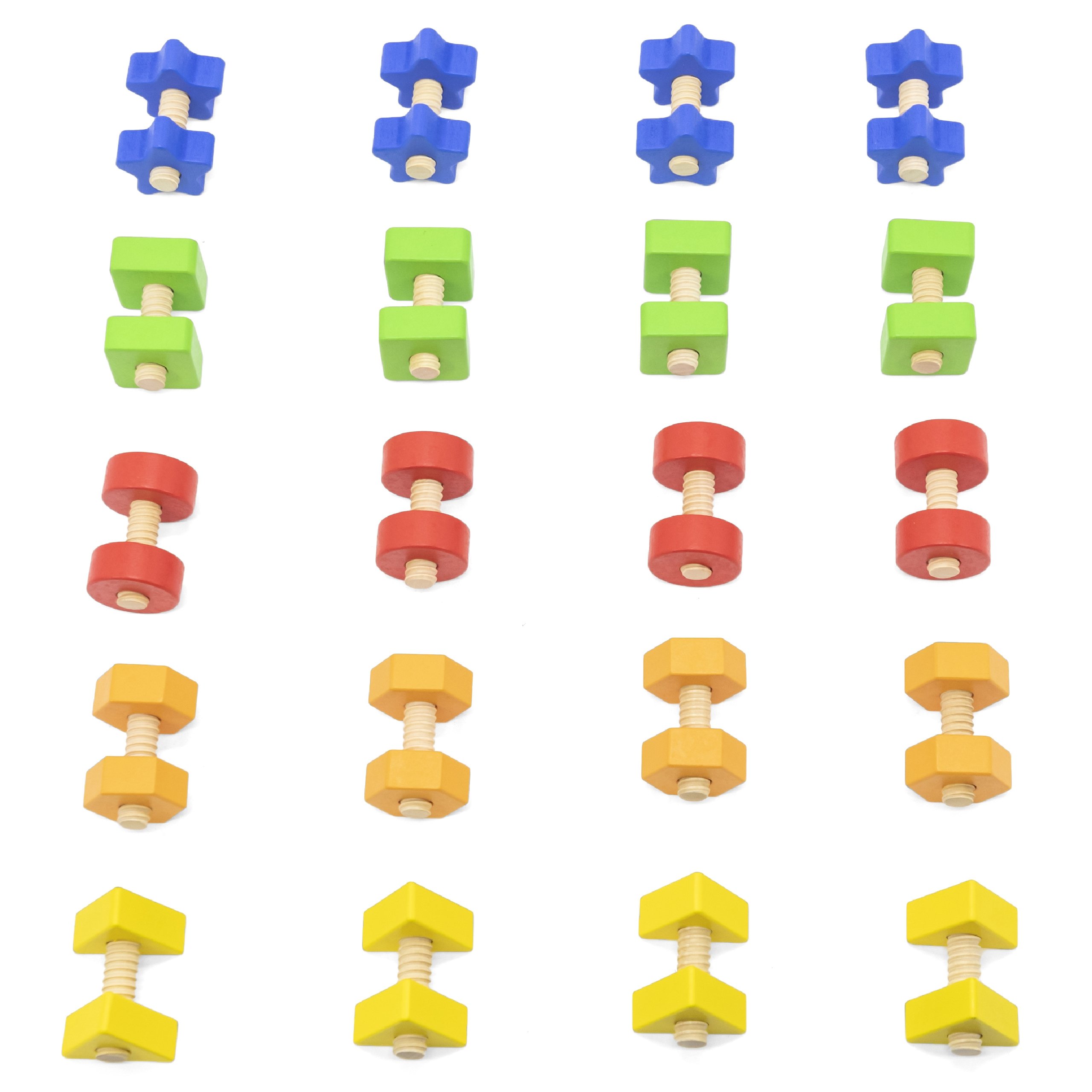 - 40 elementów w zestawie to 20 par śrub i nakrętek w 5 kolorach i kształtach