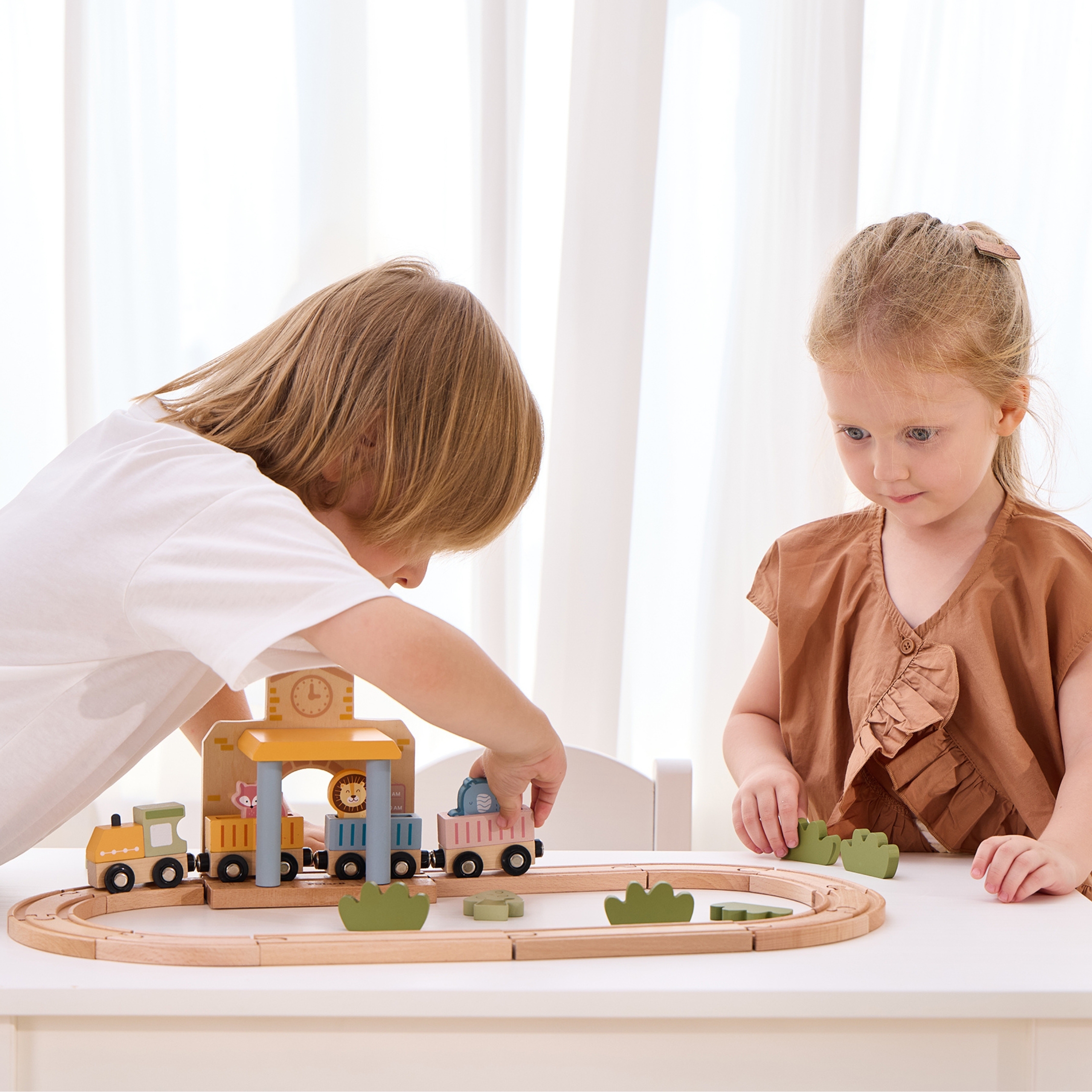 PolarB Drewniany Zestaw Kolejowy 30 el. to doskonała propozycja dla małych miłośników pociągów! Zawiera 30 elementów, w tym różnorodne tory, interaktywną stację oraz akcesoria, które pozwalają na tworzenie własnych scenariuszy zabawy. Dodatkowo dołączona książeczka z przewodnikiem ułatwia budowanie realistycznej scenerii stacji kolejowej. Dzięki funkcji dźwiękowej, uruchamianej magnetycznie podczas przejazdu pociągu przez stację, zabawa staje się jeszcze bardziej angażująca. Drewniane elementy są solidne i trwałe, a ich uniwersalność zachęca dzieci do swobodnej i kreatywnej zabawy.