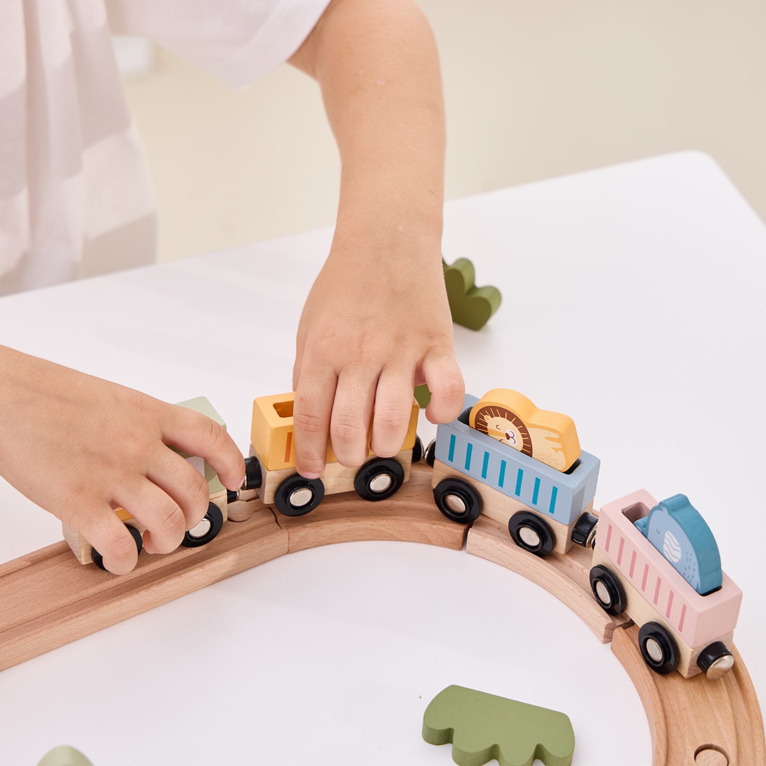 VIGA PolarB drewniany zestaw kolejowy 30 el. to estetyczna kolejka drewniana w pastelowej odsłonie, która zaprasza do układania tras i przejazdów w domowym kąciku zabaw – dzieci rozwijają koordynację oko-ręka, motorykę małą i logiczne planowanie, prowadząc pociąg po różnorodnych układach torów oraz tworząc własne historie; spójna stylistyka linii PolarB porządkuje przestrzeń i sprzyja spokojnej zabawie bez ekranów, a 30 el. gwarantuje wiele konfiguracji i długą frajdę każdego dnia – solidny wybór, który łączy naukę z kreatywnością i pięknie prezentuje się w pokoju dziecka.
