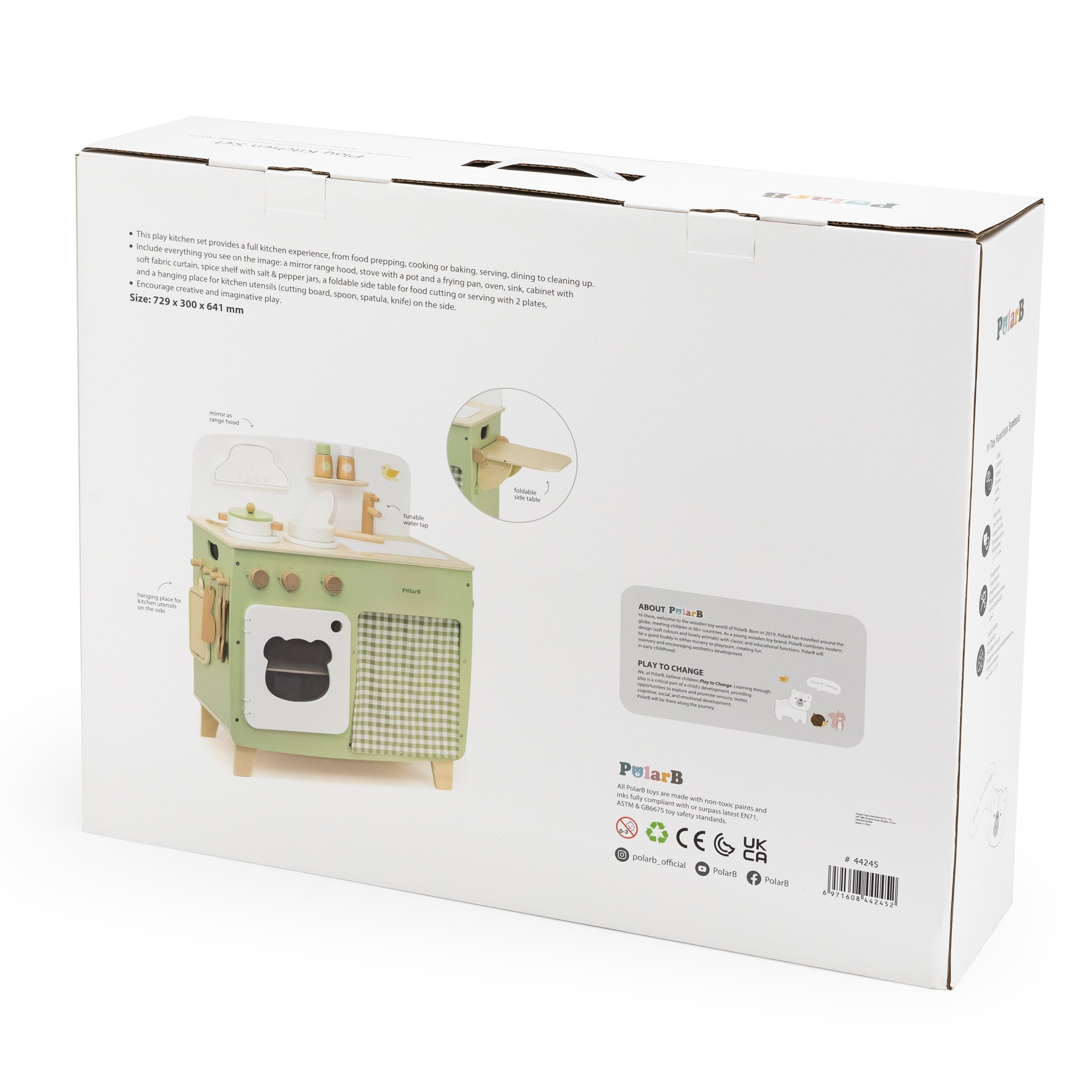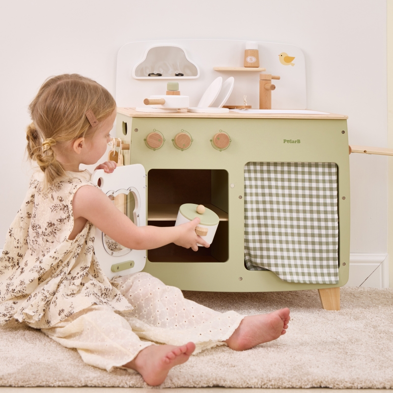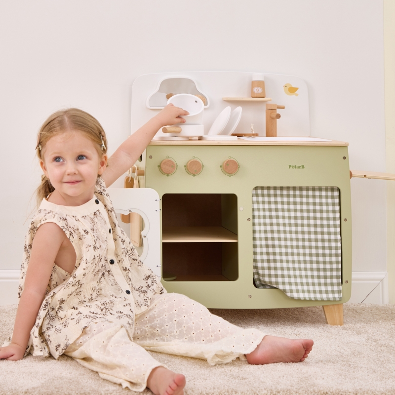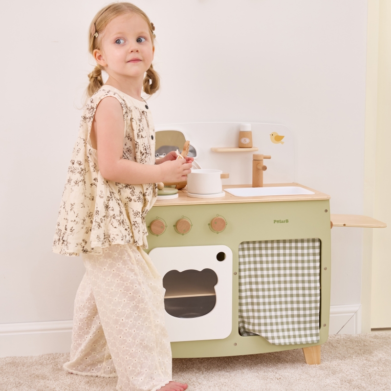 VIGA PolarB Duża Drewniana Kuchnia ze Składanym Blatem + Szafka z Zasłoną to elegancka drewniana kuchnia dla dzieci, która zaprasza do zabawy w gotowanie i kreatywnego odgrywania ról; składany blat daje dodatkową przestrzeń roboczą i pozwala zaoszczędzić miejsce po skończonej zabawie, a praktyczna szafka z zasłoną pomaga utrzymać porządek i uczy organizacji. Realistyczne elementy (piekarnik, płyta, zlew) wspierają motorykę małą, koordynację ręka–oko i kompetencje społeczne, zaś stabilna konstrukcja, bezpieczne materiały i charakterystyczna, pastelowa stylistyka PolarB sprawiają, że to ponadczasowa kuchnia VIGA do domu i przedszkola — funkcjonalna, estetyczna i gotowa na długie godziny nauki przez zabawę.