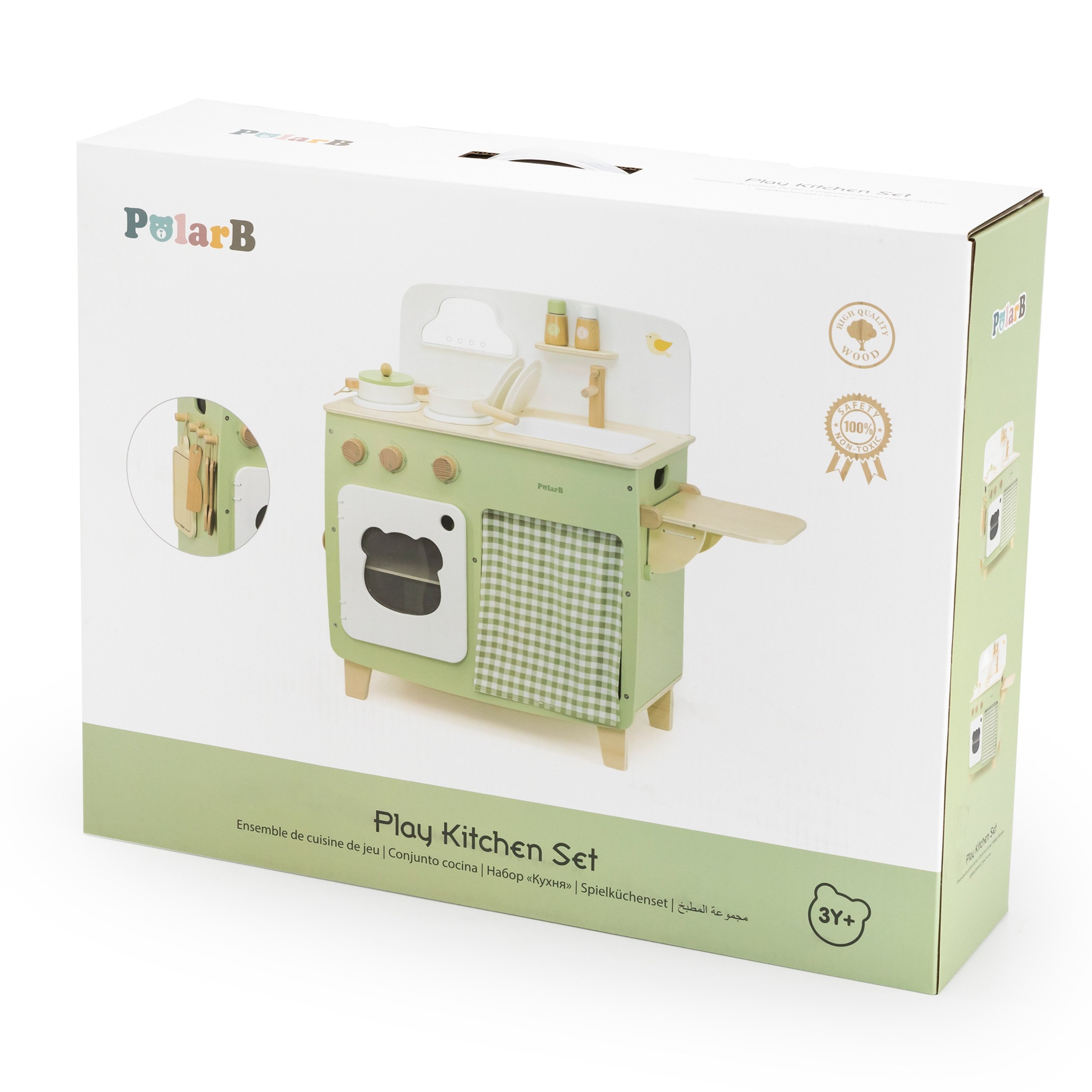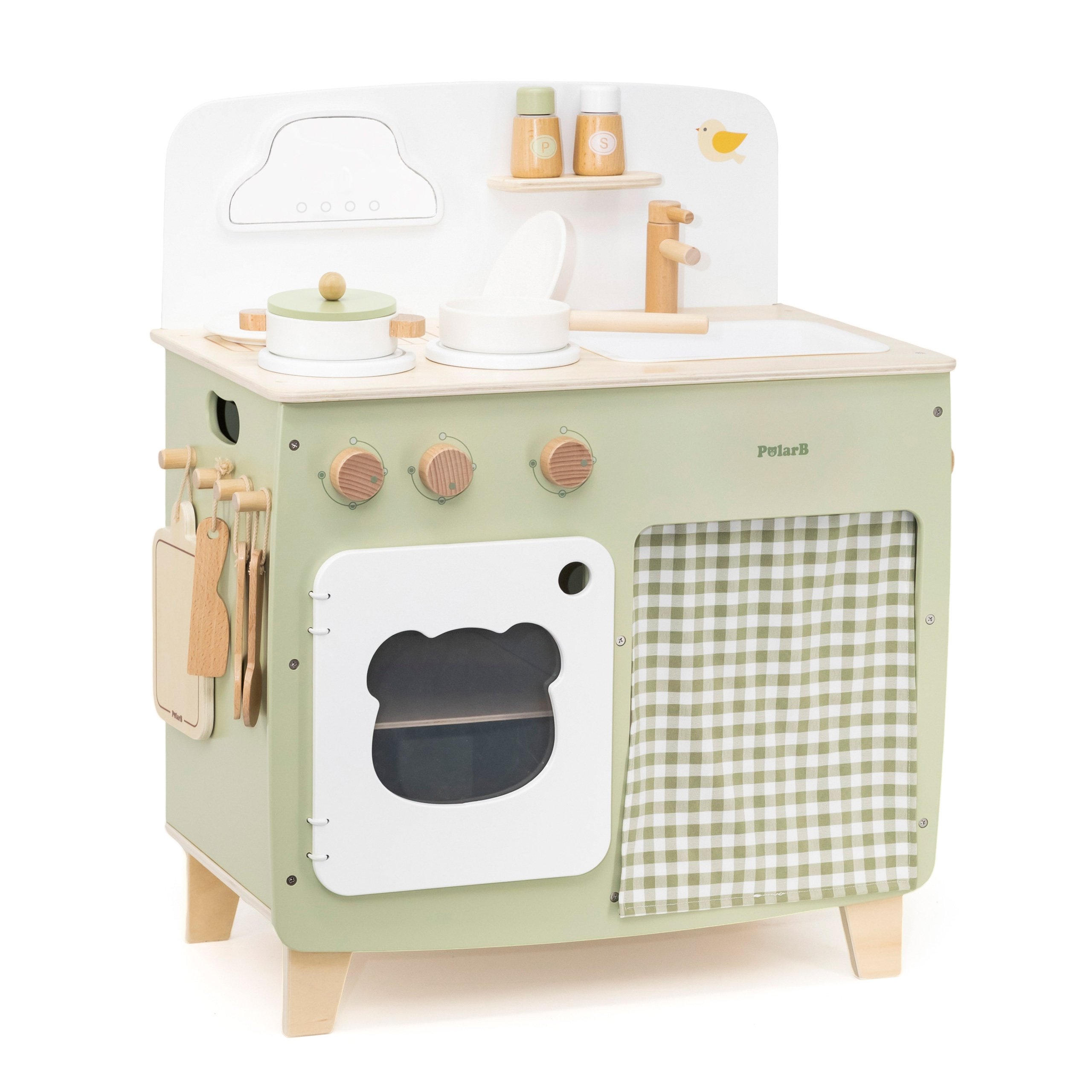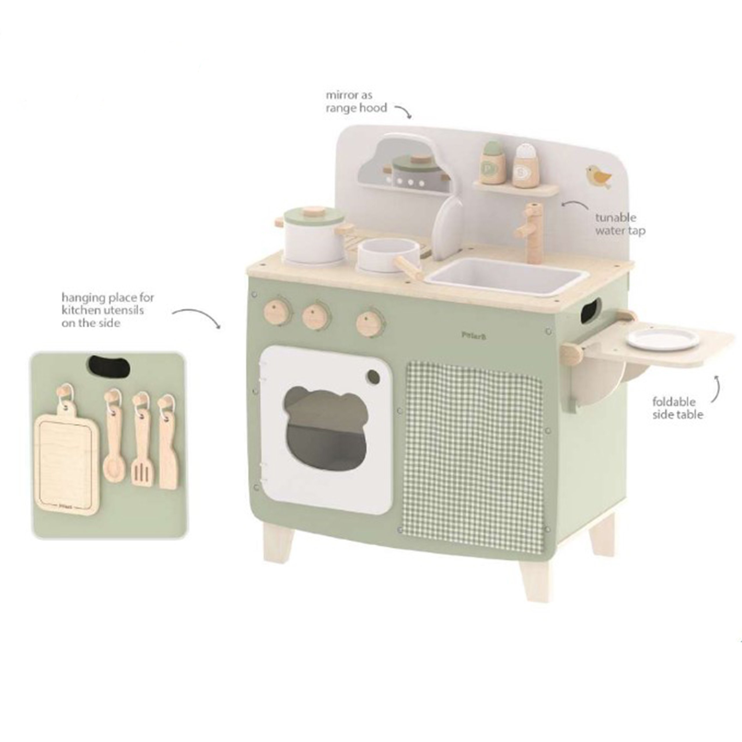 VIGA PolarB Duża Drewniana Kuchnia ze Składanym Blatem + Szafka z Zasłoną to elegancka drewniana kuchnia dla dzieci, która zaprasza do zabawy w gotowanie i kreatywnego odgrywania ról; składany blat daje dodatkową przestrzeń roboczą i pozwala zaoszczędzić miejsce po skończonej zabawie, a praktyczna szafka z zasłoną pomaga utrzymać porządek i uczy organizacji. Realistyczne elementy (piekarnik, płyta, zlew) wspierają motorykę małą, koordynację ręka–oko i kompetencje społeczne, zaś stabilna konstrukcja, bezpieczne materiały i charakterystyczna, pastelowa stylistyka PolarB sprawiają, że to ponadczasowa kuchnia VIGA do domu i przedszkola — funkcjonalna, estetyczna i gotowa na długie godziny nauki przez zabawę.