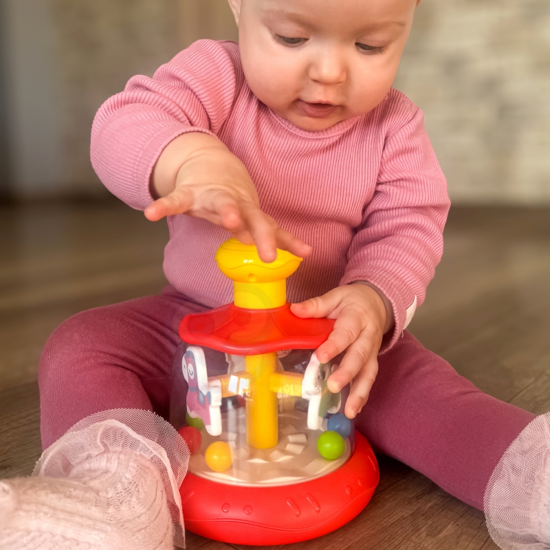 Pozwól swojemu dziecku odkrywać świat poprzez zabawę dzięki wspaniałej zabawce „Zakręcony Bączek„! Ta innowacyjna i kolorowa zabawka została stworzona z myślą o najmłodszych odkrywcach, dostarczając nie tylko mnóstwo radości, ale również wspomagając ich rozwój w kluczowych obszarach. Dzięki solidnej konstrukcji i żywym barwom, zabawka przyciąga uwagę dziecka jednocześnie wspierając rozwój ich zdolności motorycznych, sensorycznych i poznawczych. Jest to idealny wybór dla każdego rodzica, który pragnie, aby ich maluch rozwijał się w atmosferze zabawy i radości. Wystarczy, że dziecko naciśnie górną, żółtą część karuzeli, a konik i kuleczki zaczną się poruszać po całej karuzeli.