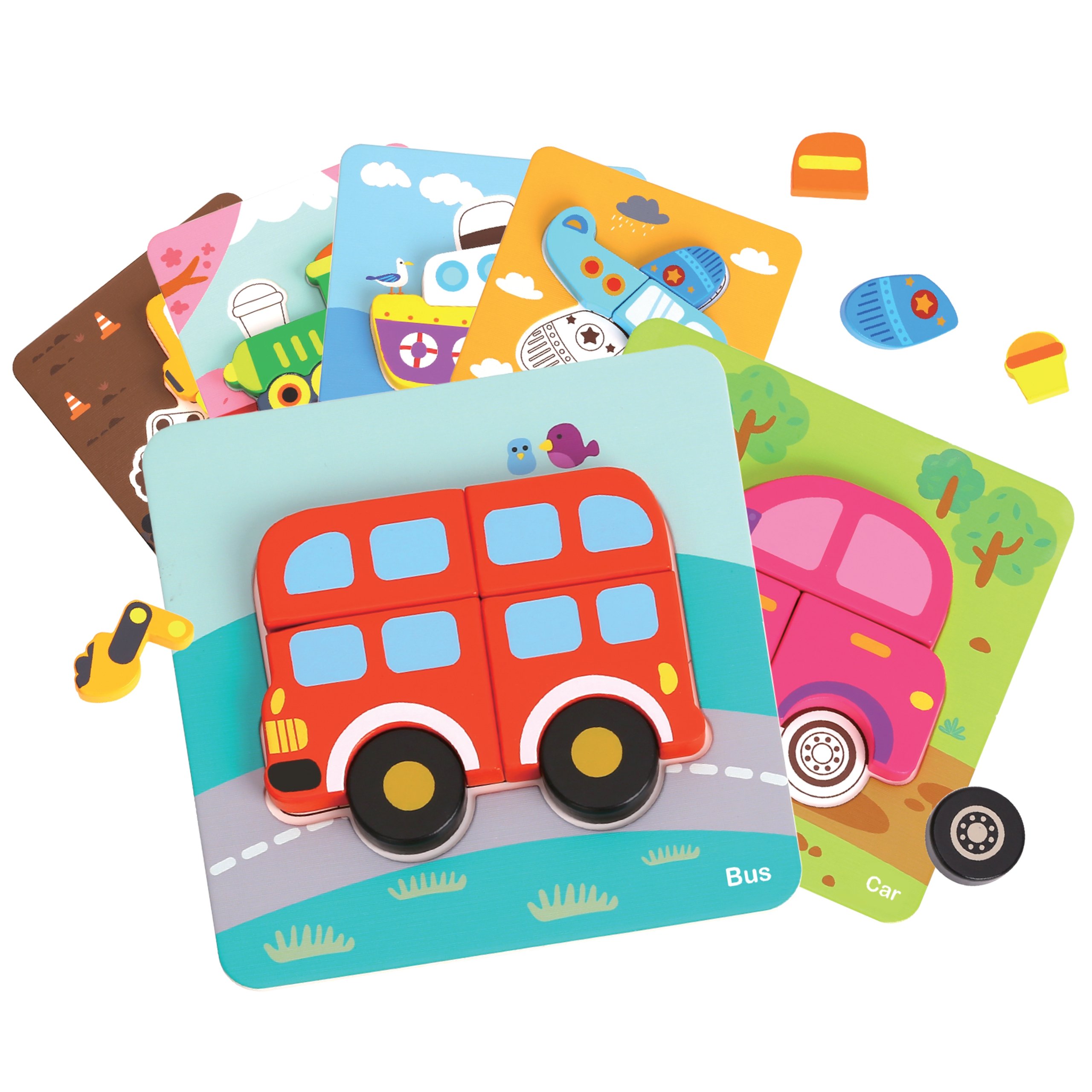 Zestaw składający się z 33 elementów, w tym 6 trwałych kolorowych kart. Zadaniem dzieci jest dopasowanie dużych, drewnianych elementów, układając je zgodnie ze wzorem aby ukończyć kolorową układankę. Specjalnie zaprojektowane wgłębienia skutecznie zapobiegają przesuwaniu się drewnianych elementów, co ułatwia małym rączkom rozwijanie umiejętności motorycznych.