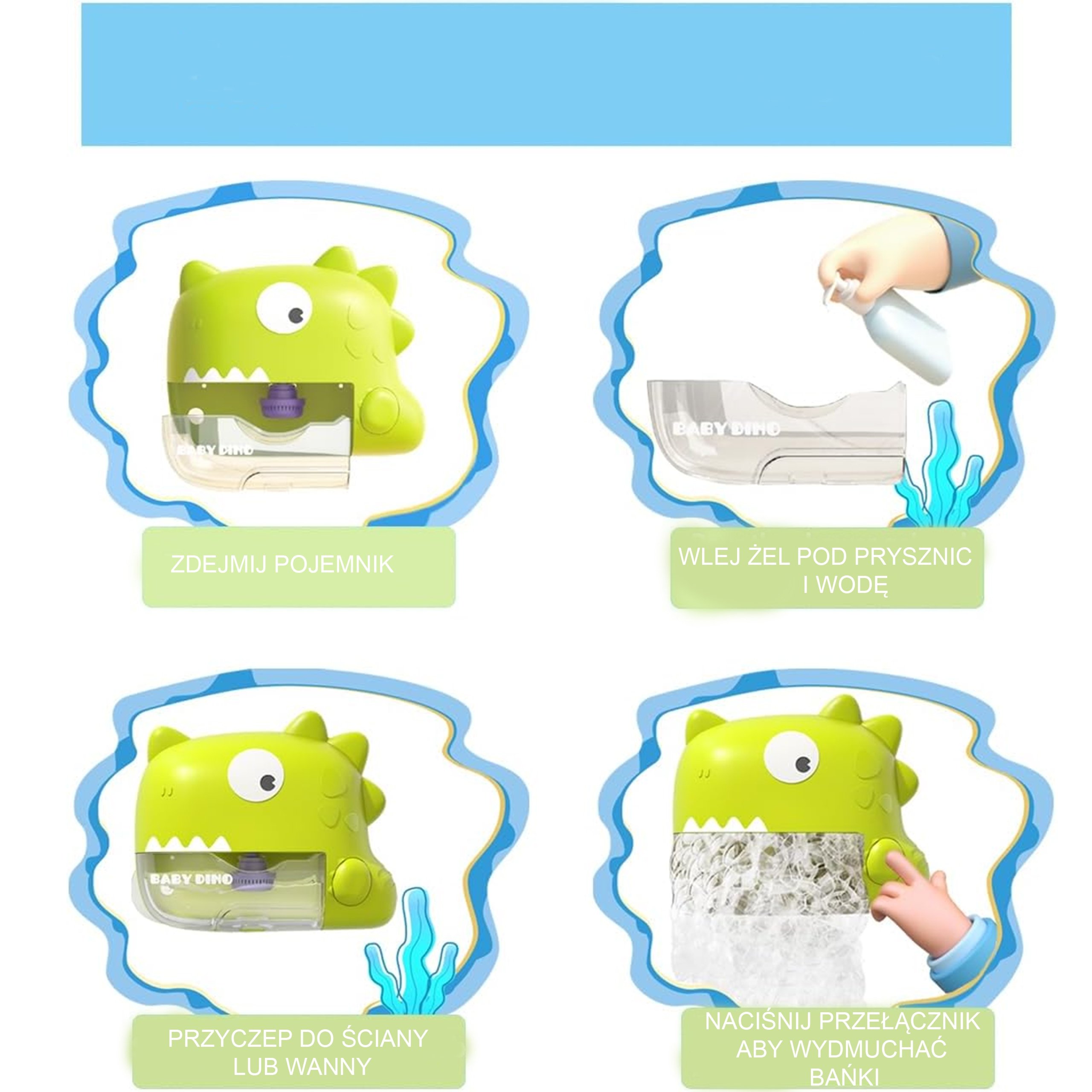 Zielony dinozaur do robienia piany marki WOOPIE zamienia kąpiel w lekki pokaz bąbelków i muzyki, w którym wanna szybko wypełnia się pianą. Automatyczne wytwarzanie ponad 5000 bąbelków i pojemnik 250 ml ułatwiają długą zabawę bez przerw, a wodoodporna obudowa IP6 z wytrzymałego ABS dobrze znosi codzienne pluskanie. Stabilne 4 przyssawki trzymają urządzenie na gładkich powierzchniach, a prosty sposób dolewania płynu sprawia, że przygotowanie kąpielowego show zajmuje chwilę. Urokliwy wygląd dinozaura dopełnia całości i naturalnie zachęca do zabawy w wodzie i poza łazienką.