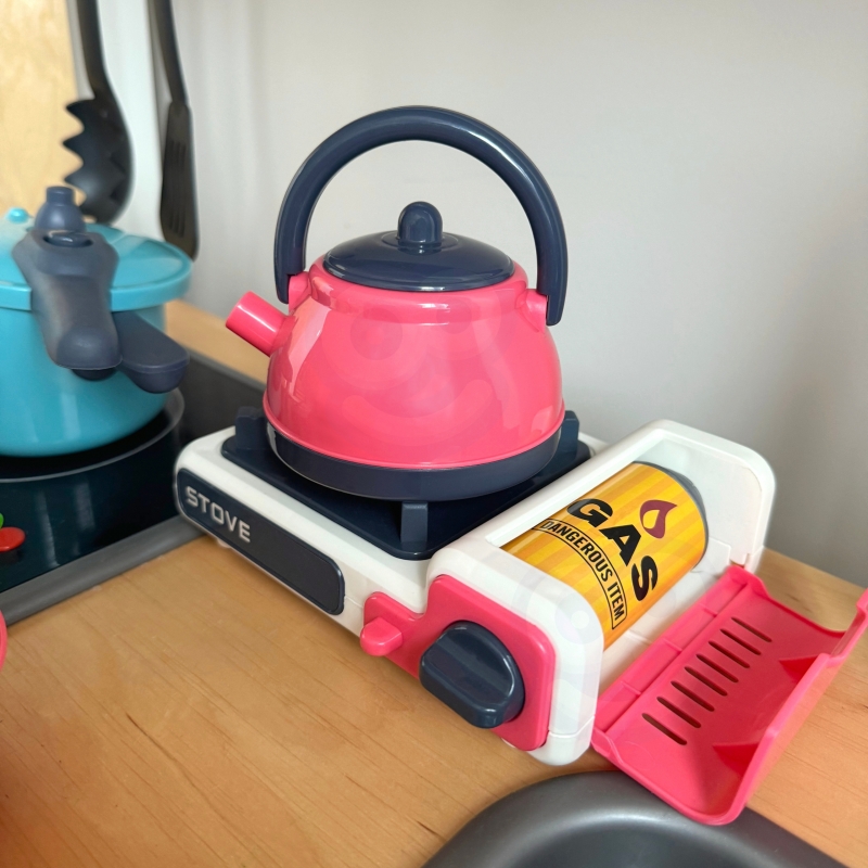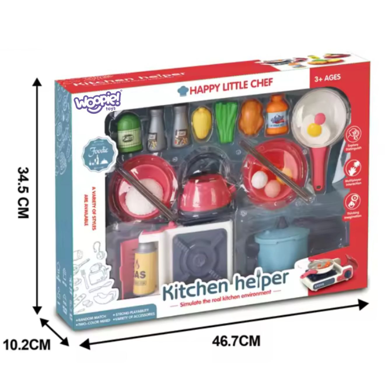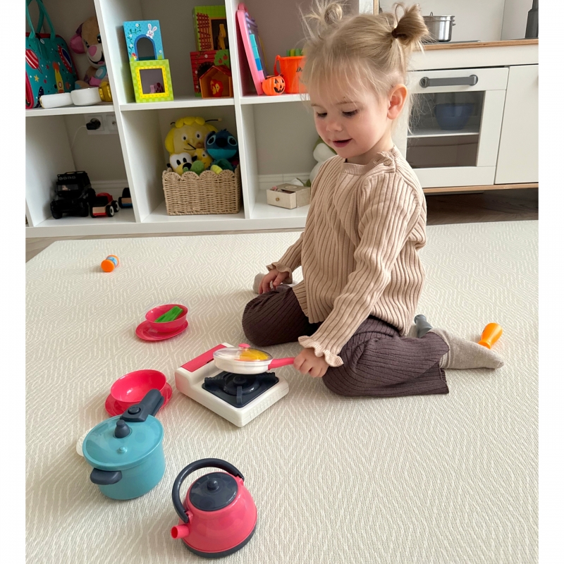 WOOPIE zestaw kuchenny Pomocnik kucharza kuchnia gazowa garnek patelnia czajnik to kompletny zestaw kuchenny, który zaprasza do twórczej zabawy w gotowanie – realistyczna kuchnia gazowa pomaga odgrywać codzienne scenki, a dopasowane elementy jak garnek, patelnia i czajnik uczą organizacji, cierpliwości oraz zasad bezpieczeństwa w kuchni; dziecko trenuje motorykę małą, koordynację oko-ręka i planowanie kolejnych działań, rozwijając wyobraźnię i nawyk porządku podczas spokojnej zabawy bez ekranów – solidne wykonanie WOOPIE i estetyczny design sprawiają, że to idealny pomysł na prezent dla małych miłośników gotowania.